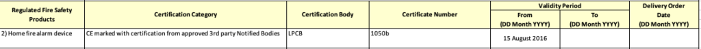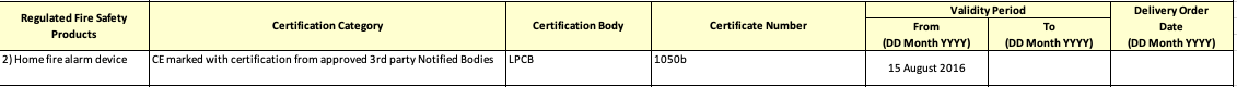 SCDF accepts multiple certifications for HFAD (home fire alarm devices) other than CoC (certificate of conformity). This model of smoke detector is certified to standard EN:14604:2005 by LPCB. This is considered as CE marked with certification from approved 3rd Party Notified Bodies.